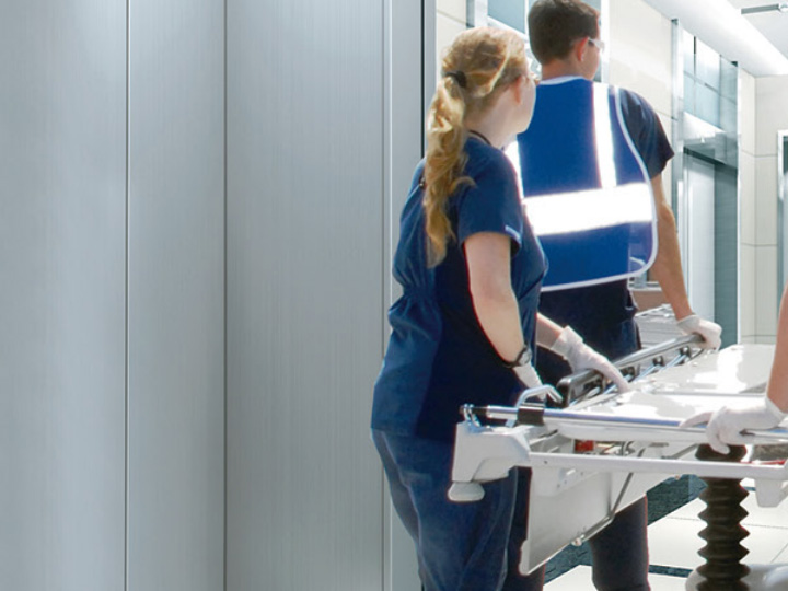 后对重井道布置,加宽轿厢设计,宽度达2100mm,加大开门宽度为1300mm,特别适合担架侧面出入。
